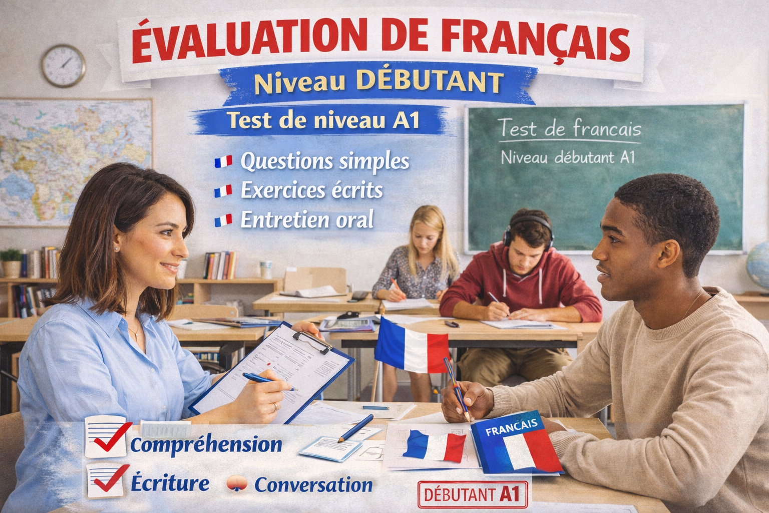 The assessment covers essential beginner-level skills, including basic vocabulary, simple grammar, pronunciation awareness, and everyday expressions. Learners will be tested on their ability to understand and use common phrases, form simple sentences, and recognize basic French structures.